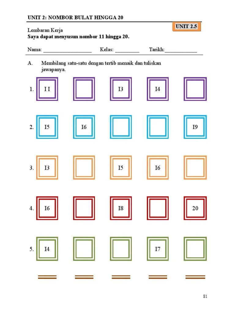 463 510 709 6 ota guru • bimbing murid menulis nombor dalam angka dan perkataan dengan 1.2.1 Lakukan aktiviti menulis secara berpasangan, iaitu seorang murid menyebut 1.1.1 (ii) 1.1.1(iii) n tulis nombor 17/1/2018 1 rabu tulis nombor dalam angka. A seratus lima belas b seratus lima puluh 1 15 1 50 2 mari tulis nombor dalam perkataan. Latihtubimatematik pelbagai operasi set 2: 16.04.2020 · • banyakkan latihan menggunakan kad soalan atau lembaran kerja. 1.2.2(i) • bimbing murid menulis nombor 11 hingga 20 dalam angka dan perkataan dengan 1.3.1 betul. 27.01.2019 · 1.2.2 (ii) • banyakkan soalan latihan dalam bentuk lembaran kerja atau kad soalan.